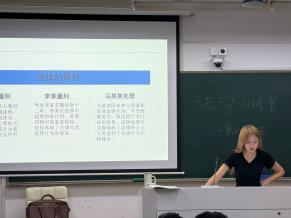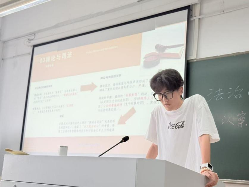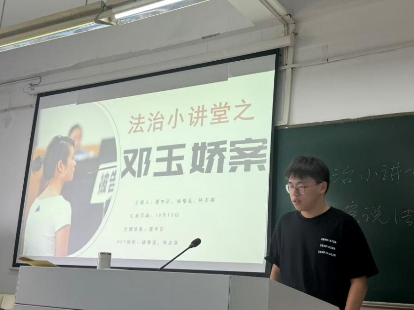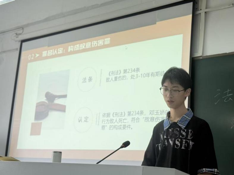 第二组:思政252班的夏中正、杨修远、林志森同学围绕邓玉娇案展开讲解。2009年,湖北巴东县服务员邓玉娇在遭受邓贵大等人酒后滋扰、侮辱并限制其离开后,持刀反抗致一死一伤。邓玉娇在案发后自首,经鉴定邓玉娇属部分刑事责任能力人。法院认定其构成故意伤害罪,但综合考虑其防卫情节、限制行为能力及自首表现,最终判决免于刑事处罚。