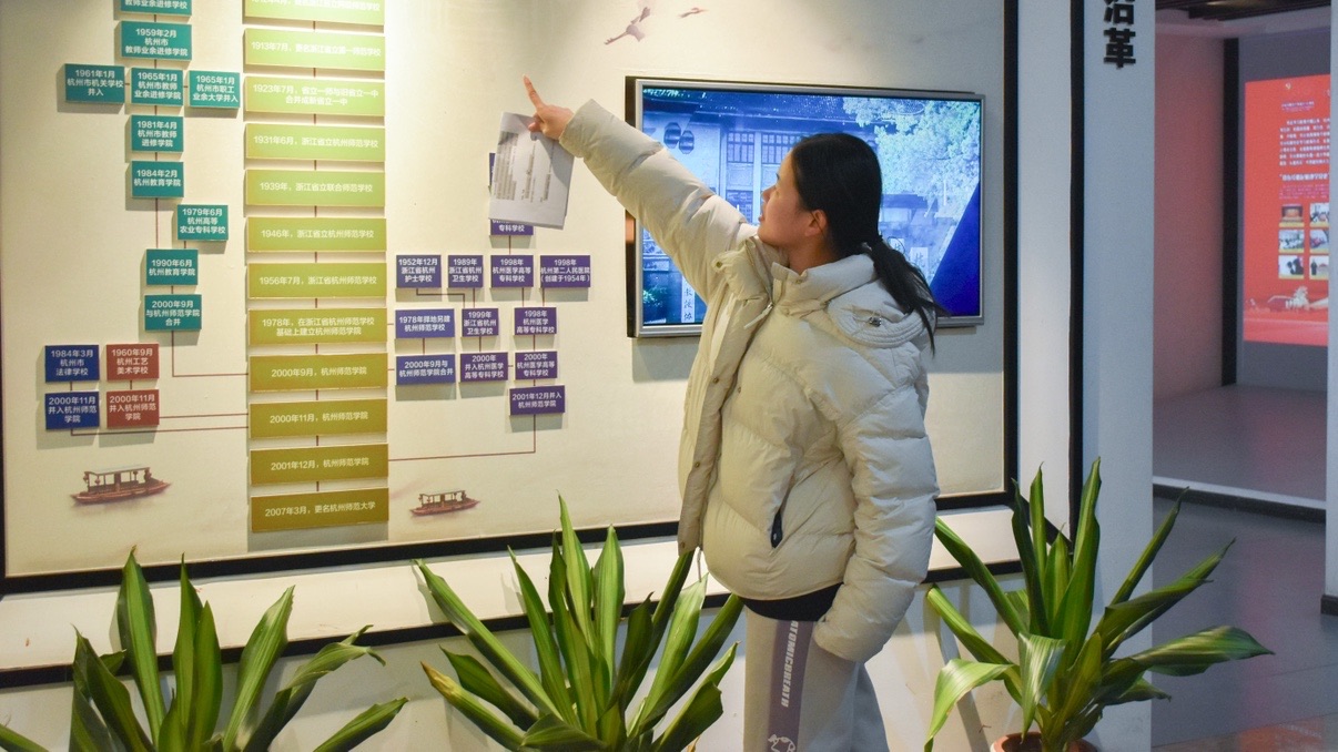 从1913年更名为浙江省立第一师范学校,到1978年杭州师范学院正式成立;从2000年六校合并的规模扩张,到2007年升格为杭州师范大学的跨越发展;再到2021年获批博士学位授予单位、2022年全力争创“双一流”……墙面的时间轴上,一个个关键节点串联起学校与国家同呼吸、与时代共奋进的百年历程。校歌的旋律隐约萦绕,1914年李叔同谱曲、夏丏尊作词的经典,让“民国气质校歌”的美誉有了更真切的分量。